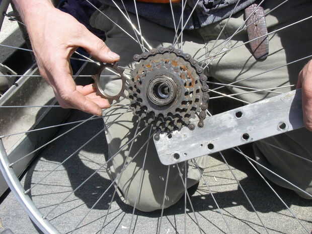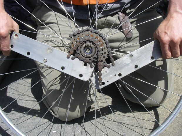 Para hacer una cadena látigo, utilizar la herramienta de "interruptor de cadena" para tomar una cadena aparte hacer dos trozos de cadena con tantos enlaces como se ve aquí. Luego Taladre tres orificios en una pieza de barra de acero y moler un divot curvo donde descansa el pedazo corto de cadena. Utilice el interruptor de cadena para unir los trozos de cadena a la barra de acero, y estás en el negocio. Si el interruptor no alcanza para colocar las cadenas en su llave, sólo libra los pernos en su lugar con un martillo.