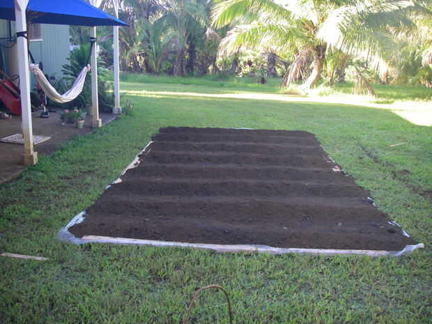 Stephanie y JC hizo este "jardín portátil". En primer lugar colocar lona de plástico y había llenado negro suciedad en él. Si necesita puede arrastrar el jardín a una nueva ubicación.