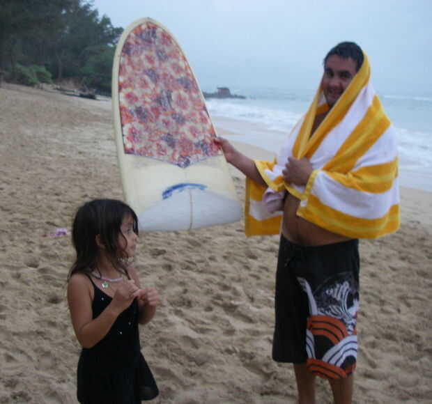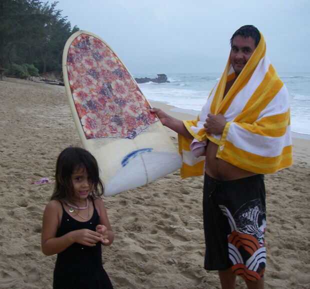 Ella es demasiado pequeño para usar en olas tan grandes, pero Bert demostró algunos movimientos hábiles con la Junta. Visto aquí en la playa frente al centro de juventud de Paia, Maui.