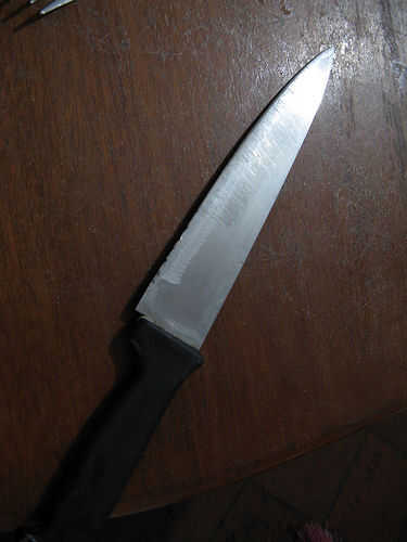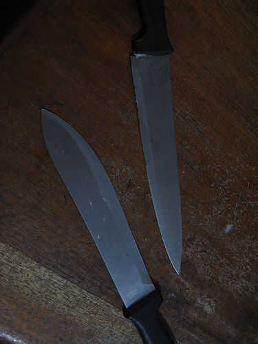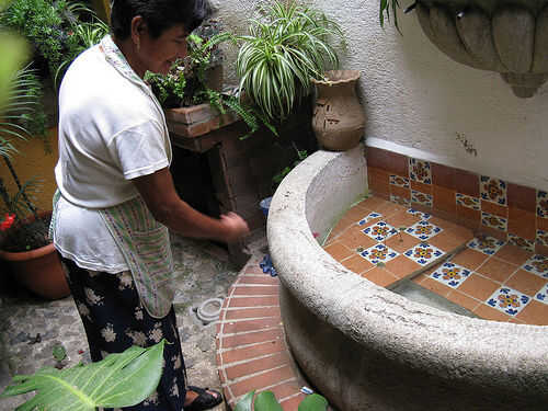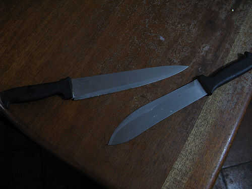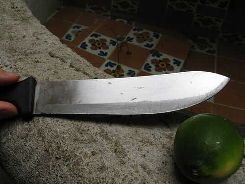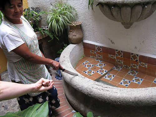 Aquí, Don Mati demuestra cómo ella afila cuchillos por el roce contra el lavabo de una fuente de piedra. Ella está usando esencialmente el mismo truco en cuchillo afilado trucos: improvisado afilar piedras, frotando el cuchillo de la punta de la hoja. Puede ser feo, pero no se puede argumentar con los resultados: ha tomado un cuchillo serrado super barato de made in China y se convirtió en absolutamente un instrumento fuerte y útil. Ella cocina todos los días y volver a afila los cuchillos sobre una o dos veces a la semana.