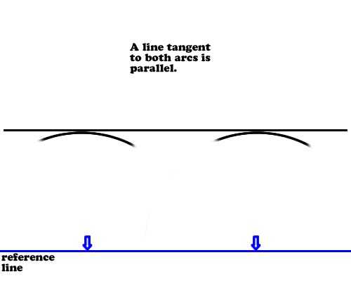 Esto tiene las mismas aplicaciones como número 3 de truco pero se utiliza para hacer líneas paralelas en vez de perpendicular. De cualquier 2 puntos a lo largo de la línea de referencia (el más separados mejor) hacer un arco con el radio de desplazamiento deseado. Si usted tira una cadena, poner un borde recto o una línea láser un disparo que apenas tocó (tangente a) ambos arcos, que sería paralelo a la línea de referencia.
