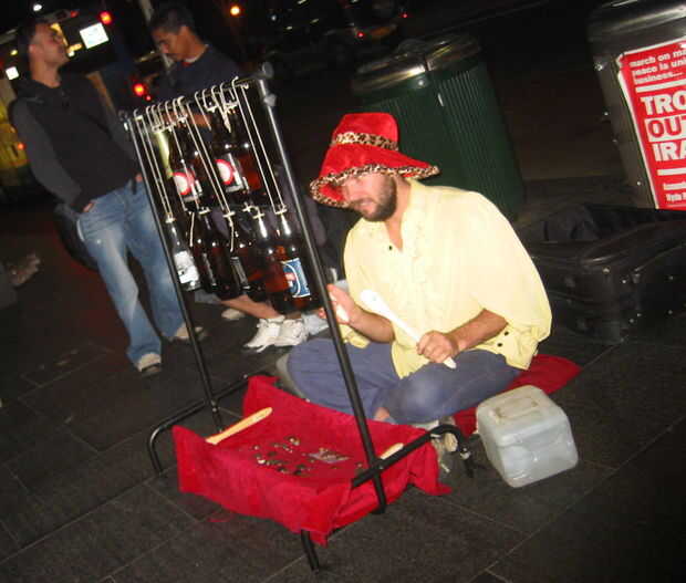 Él está golpeando lejos energéticamente sobre ellos con cucharas de madera. Sonaba realmente bien.