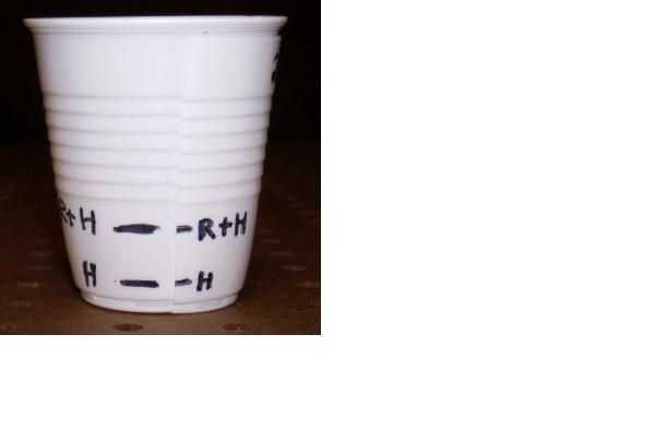 Para cada tamaño de la taza, tomar una taza nueva y poner agua en él que es un tercio la cantidad de la hornada final de epoxy mezclado y haga una marca en ese nivel en el exterior de la Copa. Vierta agua en una taza limpia y marca su nivel en el exterior y la etiqueta que marca como "H" para endurecedor. Poner agua en la primera Copa otra vez, a su nivel marcado, vierta agua en la segunda Copa encima del agua ya en él, luego repetir. Marque la parte superior del nivel del agua en el exterior de la segunda Copa y etiquételo "R + H" de resina y endurecedor.