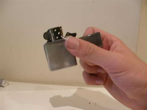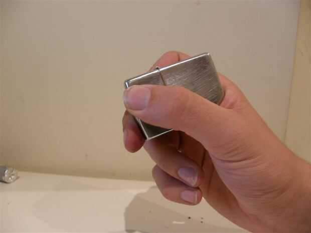 Tomar la mano de Zippo-ing, pellizque la parte superior justo por encima de la bisagra entre su índice y pulgar, bisagra hacia arriba.