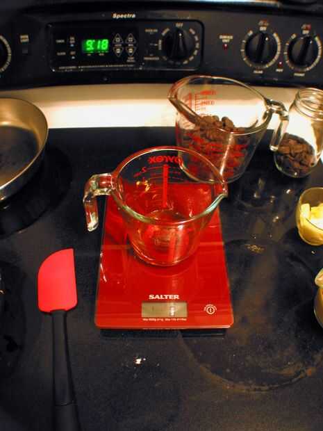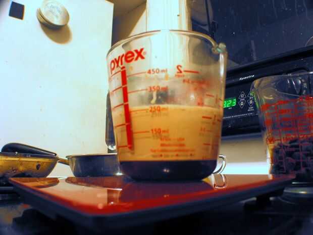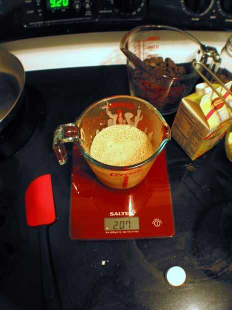 En otro recipiente, pesan los 63 gramos de miel. Tara (cero) la escala con este contenedor todavía en él.