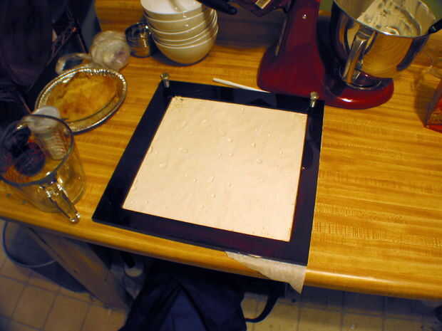 En primer lugar, preparar el segundo marco. Pelar el papel para hornear (¡ con cuidado!) de la capa superior de la melcocha y establecido el marco superior. Ahora estás listo para ir!