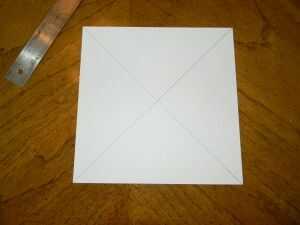 Para la parte inferior de la caja de corte una 9" cuadrada y trazar una línea desde cada esquina a esquina en el lado del mal/parte posterior del papel. (Para la parte superior de la caja, use una escuadra de 9 1/2") Es bueno usar un medio en papel pesado, especialmente para la parte inferior para que su caja es resistente.