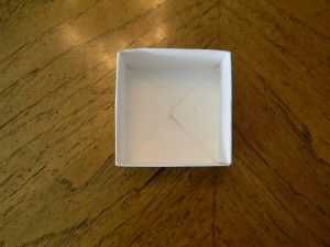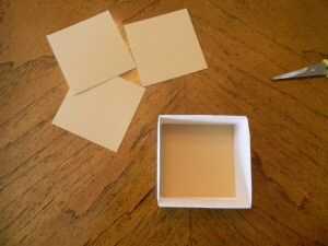 Doble los lados pequeños para garantizar sus pliegues anteriores y termine con la parte inferior de la caja. Puede hacer con un trozo de cinta en la mitad inferior de la caja. También puede cortar 3" pedazo de papel para crear un forro para la caja del caramelo (mostrado abajo). Ahora sólo repita los pasos con un cuadrado de 9 1/2" para crear la parte superior de la caja del caramelo.