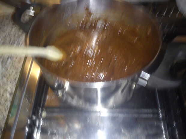 Por lo tanto, colocar la masa en la sartén y echar un chorrito de leche. Aquí funden en el chocolate y deje para cocinar por unos minutos revolviendo constantemente para evitar que se pegue. Esto va hacer que la mezcla de nuevo liquidez pero no!