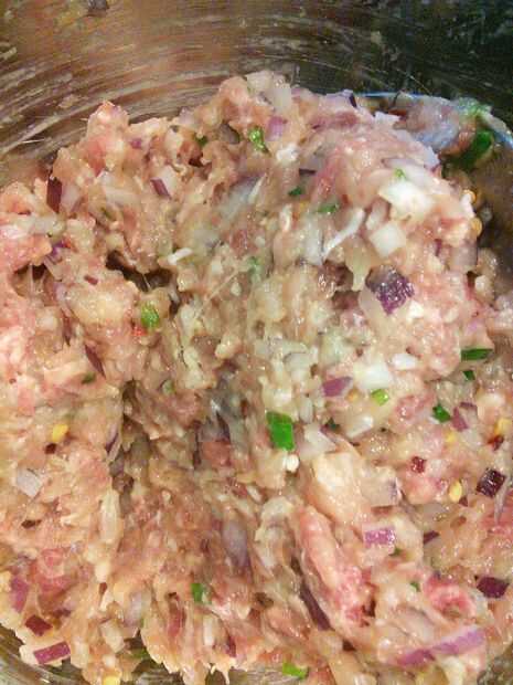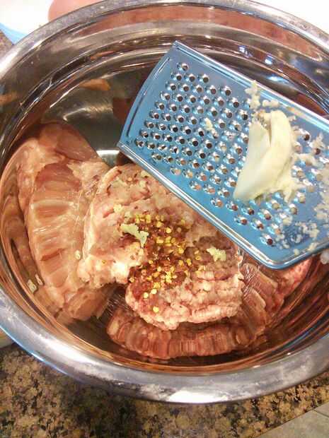 • A la carne añadir batido encima de huevo, cebolla, ajo machacado, aceite de trufa, sal al gusto, un té cuchara de cebollino y escamas frías. Mezclar el relleno correctamente y dejar a un lado.