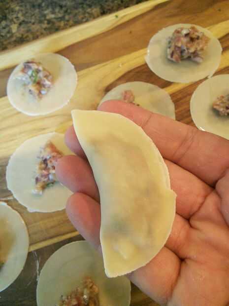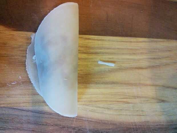 • Pliegue del centro y presione los bordes para que la hoja se pega uno al otro. Encontrar el pelmeni circular semi fáciles de forma.
