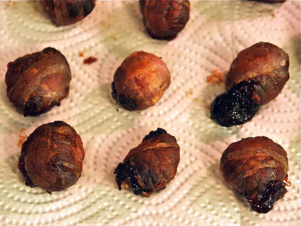 Colocarlos en un par de toallas de papel para escurrir la grasa. Hacer lo mismo con las ciruelas pasas después que estén hechas.