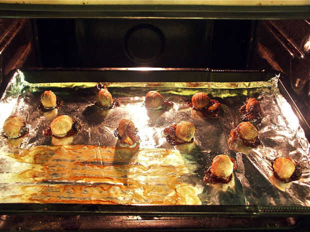Ya que el tocino se contrae durante la cocción es muy probable que con algunas ciruelas pasas un poco de pulpa se exprima o incluso la piedra de pistacho. No hay que preocuparse, sin embargo, sólo las tuercas nuevamente en las ciruelas después de cocinar y cortar cualquier exceso pulpa. Dependiendo de su tolerancia al calor puede hacerlo enseguida o después dejas enfríen un poco. Desde entonces se convierten en más firmes mientras refrigeración esto puede hacerse rápidamente sin embargo.