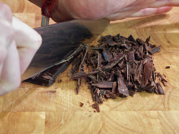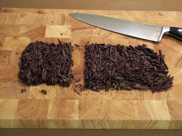 Pique el bloque entero de chocolate por afeitado apagado escamas finas con el cuchillo de cocina. Esto hará que el proceso de fusión más rápida y más fácil de lo que sería con trozos grandes. Poner sobre dos tercios en el tazón de fuente.