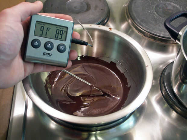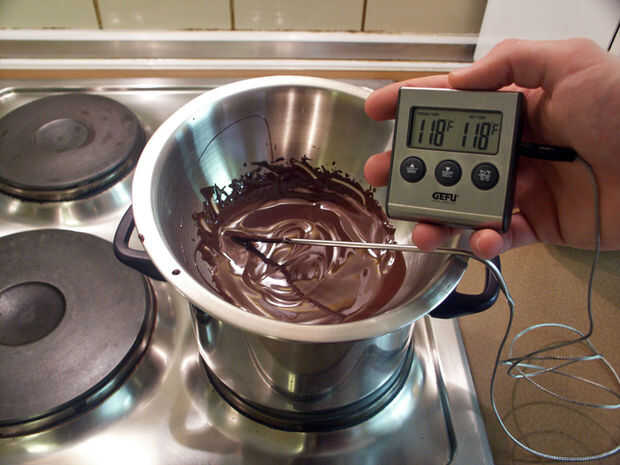 Revolver hasta que el chocolate se haya derretido completamente. Verifique la temperatura y mantener la calefacción hasta que alcance sobre el ° F 118 a 48 ° C. Debido al contenido de cacao alta las temperaturas que busca están en el extremo superior del espectro templar el chocolate.