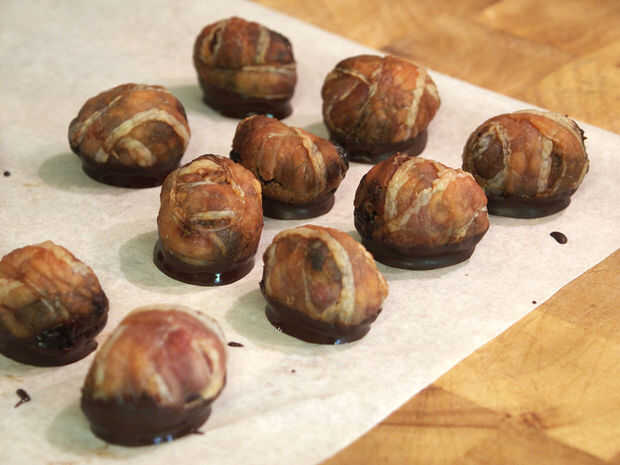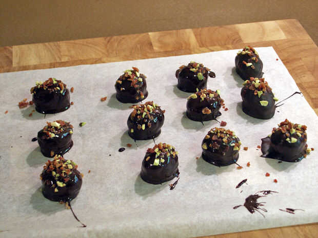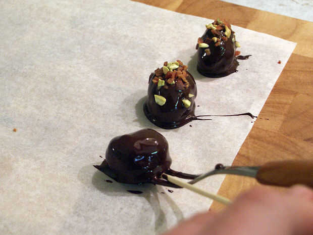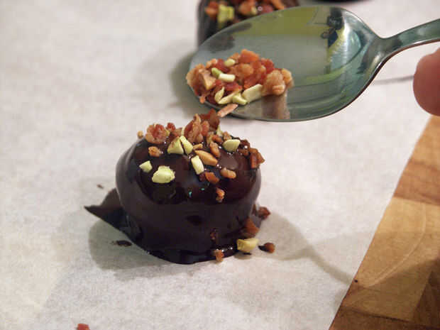Espolvoree un poco de la mezcla de pistacho, tocino sobre cada trufa con una cuchara de té.