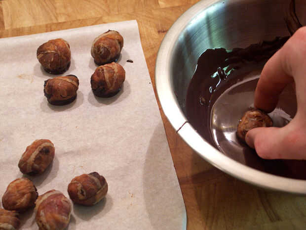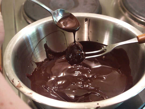 Coloque las trufas en una hoja de papel de cera. Me gusta usar un pincho para obtener la trufa de la horquilla para evitar que se fuera el chocolate demasiado. Usted puede hacer un par de trufas antes de empezar a decorar, el chocolate no establecerlo rápidamente.