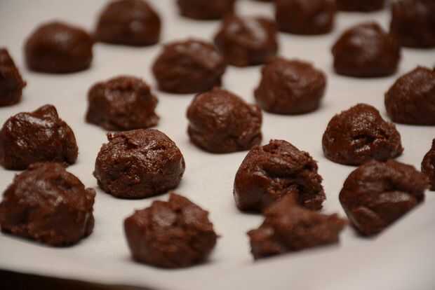 Hacer bolas de tamaño de avellanas de chocolate relleno y colocarlos en el papel.