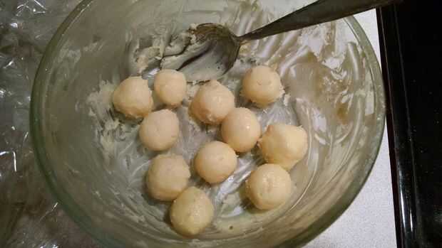 Rodar en una bola con sus dedos y manos. La mezcla se pegue en tus manos.