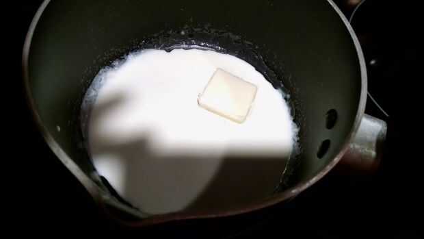 Coloque 1/8 taza crema de leche y 1/2 cucharada de mantequilla en una cacerola pequeña sobre fuego medio-alto.