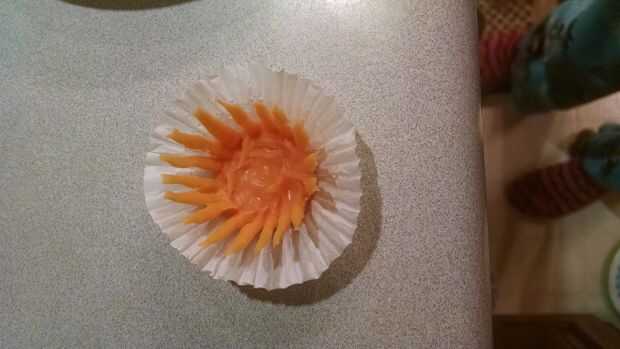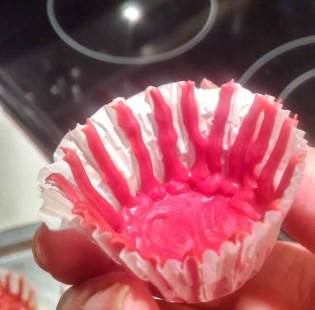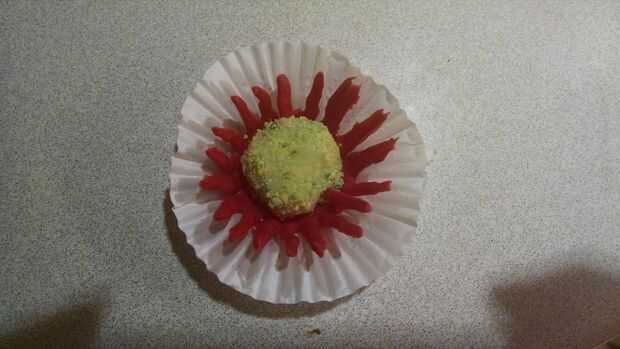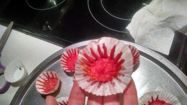 Abrir los pétalos de Chocolate: Tire suavemente hacia abajo el borde superior del papel para hornear de Copa (sólo tire hacia abajo sobre un 1/4 de pulgada). Luego, recorriendo el borde superior, continuar con cuidado hale hacia abajo el papel 1/4 de pulgada. Finalmente, tire el papel el resto del camino hacia abajo y tire la flor. Si uno de los pétalos se rompe, solo pegarlo en la trufa (ver imagen).