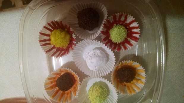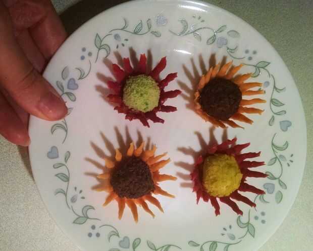 Para terminar las trufas flor, simplemente coloque una trufa cubierta en cada flor del chocolate. Puede dejar las trufas de flor en las mini tazas para hornear o pelar apagado. Trufas de mantienen en la nevera durante unas 2 semanas o en el congelador durante unos meses. Trufas se sirven mejor a temperatura ambiente.