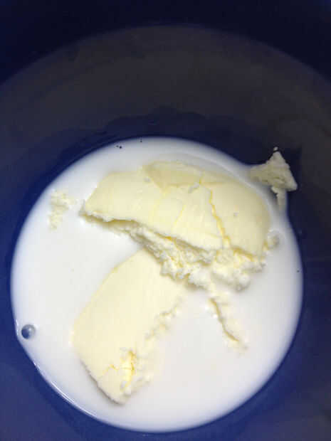 Calentar la leche y la mantequilla en el microondas durante 40 segundos, revolver hasta que la mantequilla se derrite