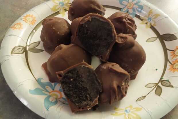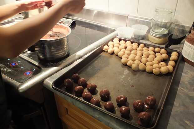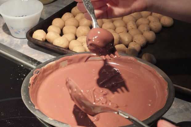 Separar las trufas congeladas. Sumerja en chocolate derretido, permitiendo que el exceso gotee apagado.