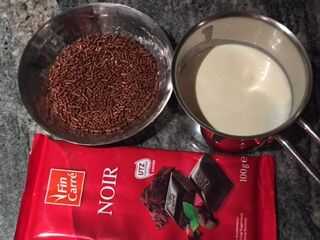 Hacer estas trufas de ganache de sobra. Yummo!Paso 1: Ganache de Chocolate 1/4 taza de leche2 cucharadas de mantequillachocolate negro 150 gCalentar la leche y la mantequilla en el microondas durante 40 segundos, revolver hasta que la mantequilla se