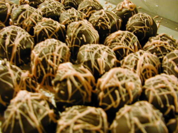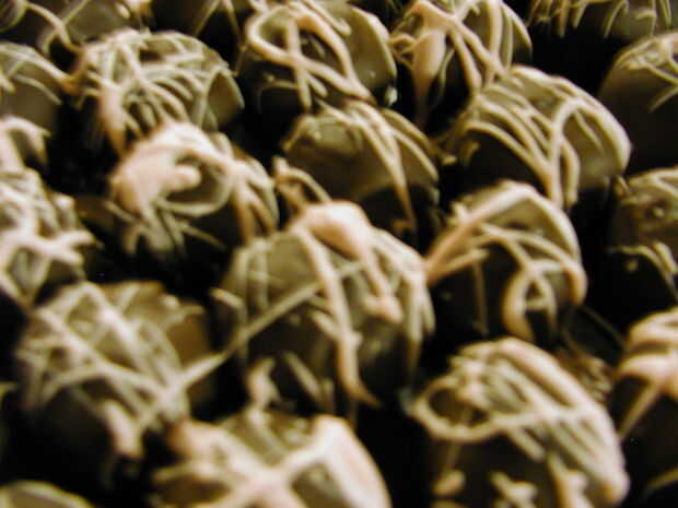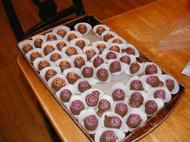 Si usted quiere controlar sus diseños y tubo corazones o remolinos, luego sacar el caramelo se funde en una manga pastelera con una punta redonda muy pequeña. Si realmente no se preocupan, entonces simplemente suave el caramelo se derrite hacia abajo con un poco de manteca y rociar por toda la parte superior de la trufa con una cuchara. Cuidadosamente puede chasquear la cuchara y hace pivotar alrededor a difundirlo alrededor de cuerdas delgadas, pero tenga cuidado de no hacer un lío grande. Si haces un lío, limpiarlo enseguida antes de que el caramelo se endurece.