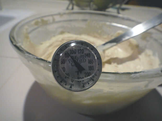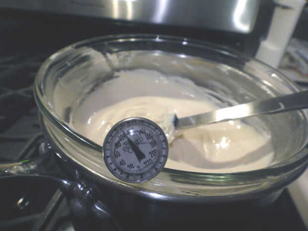 El recipiente vuelva a colocar la caldera doble (tenga cuidado de no conseguir ninguna agua en el recipiente!) y que la temperatura de la espalda chocolate hasta su temperatura de Temple. (Decir cinco veces rápido!)