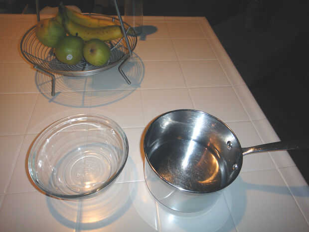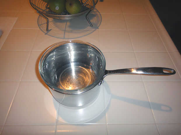 Poner 1 pulgada de agua en la cacerola y colocar el vaso de vidrio en la olla, asegurándose de que la parte inferior no toque el agua. Voila! Ahora tienes una caldera doble.