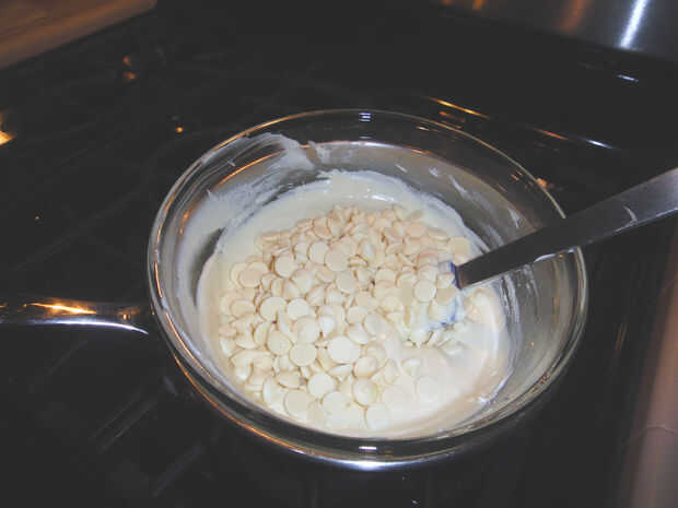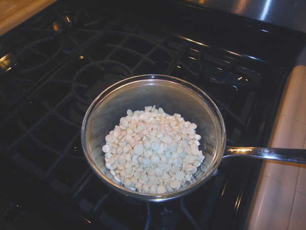 Agregue una bolsa de chips de chocolate a la taza del baño María. Con una espátula de goma, revolver el chocolate hasta que simplemente se derrite suave. Nunca se debe calentar el chocolate a más de 120° F (49° C).