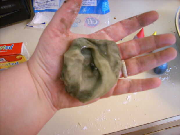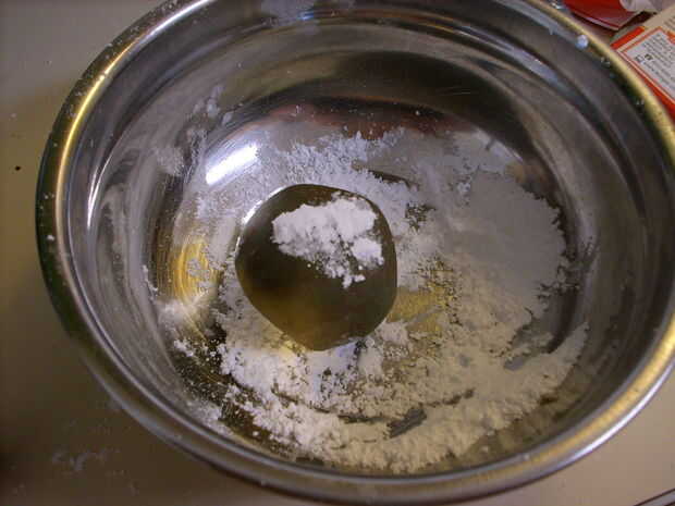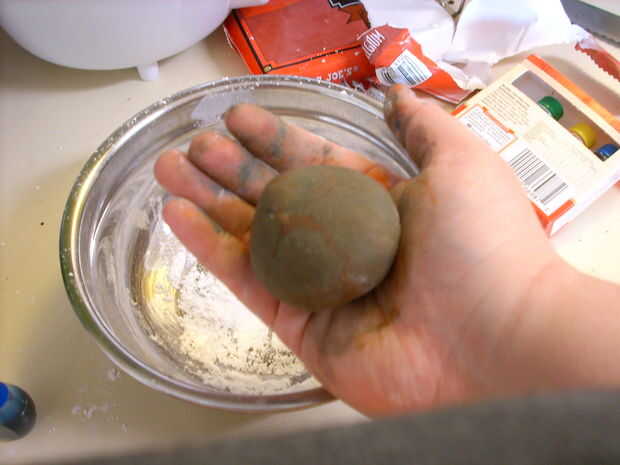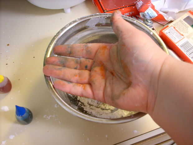 Doblar y mezclar cuidadosamente. Ponerlo en un tazón para mezclar, por lo que no espolvorea colorante a tu contador. Tenga en cuenta que habrá manchado las manos después de esto.