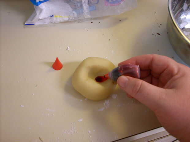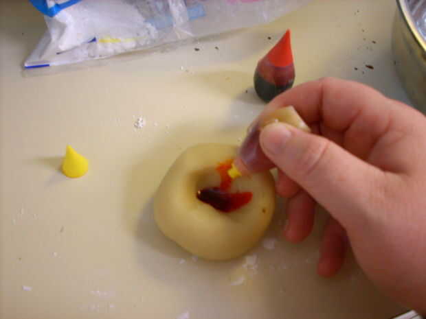 Hacer un pozo en el centro de la pasta de almendra y poner los siguientes colores en ella (para un escarabajo grisáceo dun):