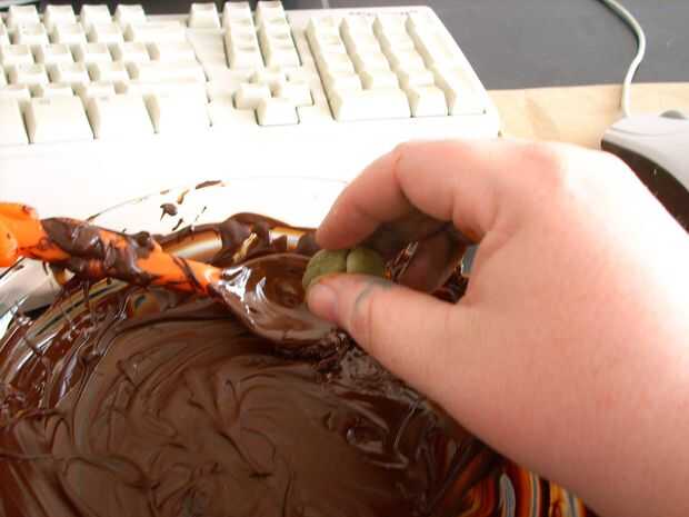 Una vez que te gusta tu beetlebody, utilice un poco de chocolate derretido a attact le para la bola de estiércol. Este chocolate queda cubrir el resto de las trufas.