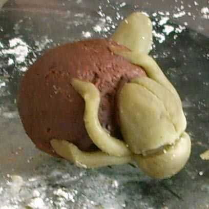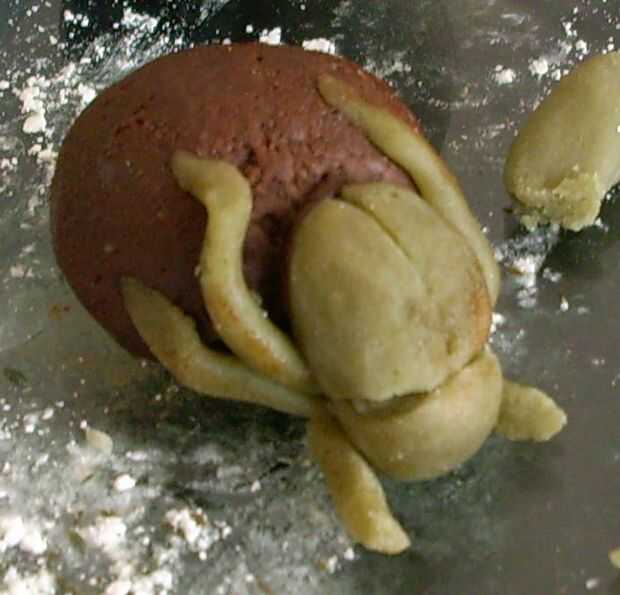 Sujete las piernas metiendo debajo del cuerpo. Puedes poner un poco de agua en la parte 'atadura' y mezclarlos con algo agudo; Utilicé la aguja. Presione el otro extremo al escarabajo.