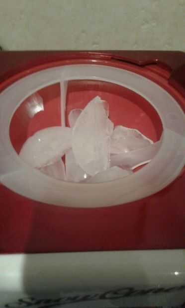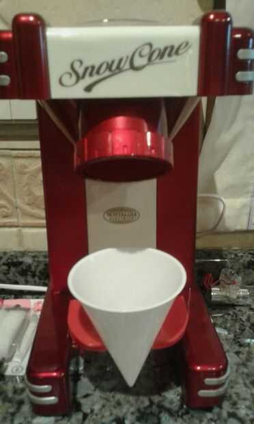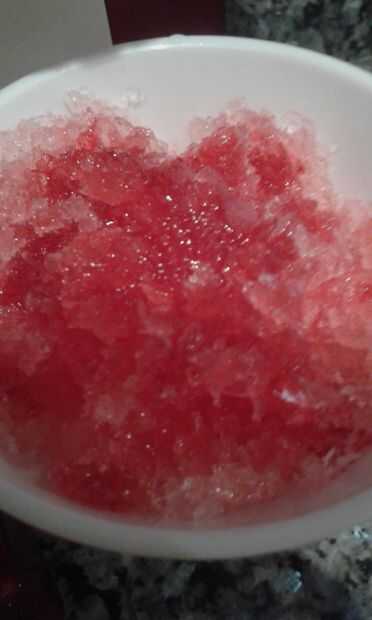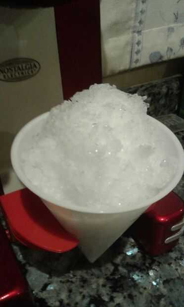 tengo una máquina de cono de nieve por lo que te voy a mostrar cómo hacer un cono de nieve. Te necesitan hielo cubos y un jarabe de fresa (el sabor es opcional). Poner el hielo y encender la máquina. La nieve comenzará a salir. Poner algún jarabe y una pajita para decorarlo.