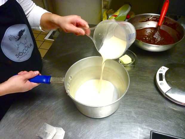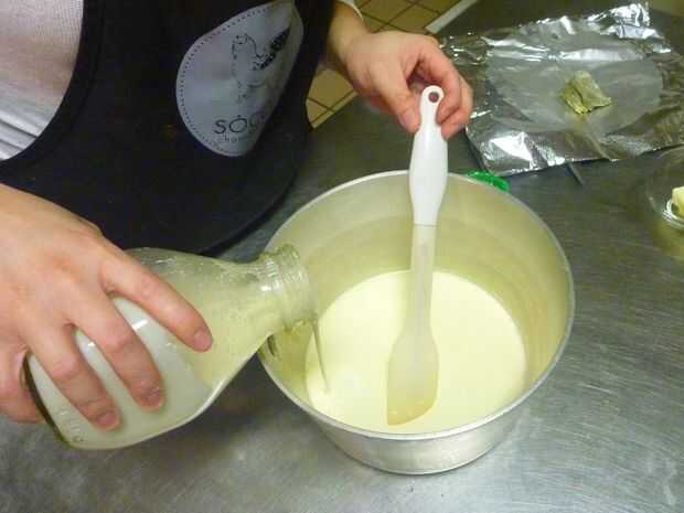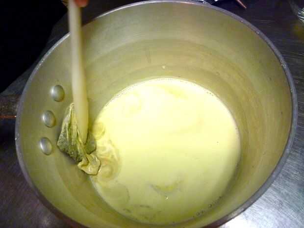 Mezclar la crema y el azúcar invertido en una cacerola mediana. Poner a hervir y retirar del fuego. Agregar el té de jazmín y revolver la mezcla. Cubrir la bandeja con papel sulfurizado o papel de aluminio y dejar reposar durante 15 minutos.