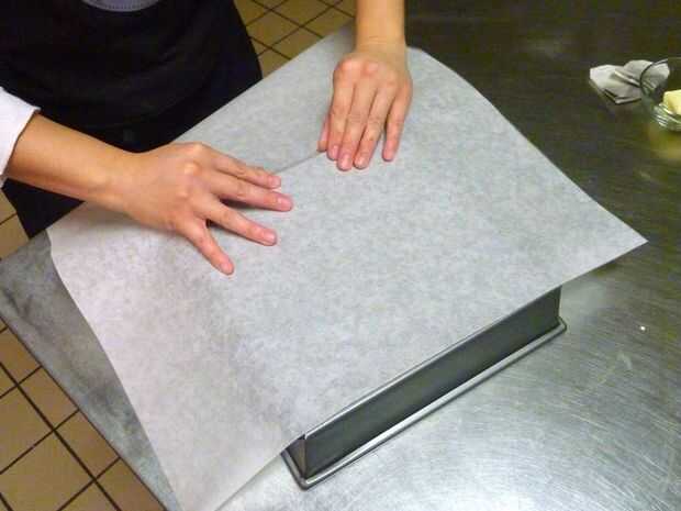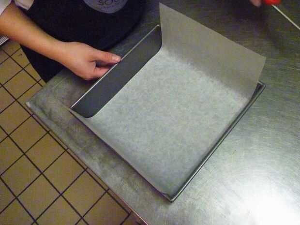 La línea del fondo y los lados de la bandeja para hornear cuadrada de 8 pulgadas con papel de pergamino. El quiere más fácil de hacerlo es flip boca abajo y dobla el papel pergamino a la altura de la bandeja (superior e inferior). Asegúrese de que no dobla los cuatro lados para que puedan tener algunos mangos para sacar el ganache por más tarde.