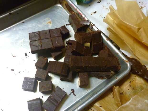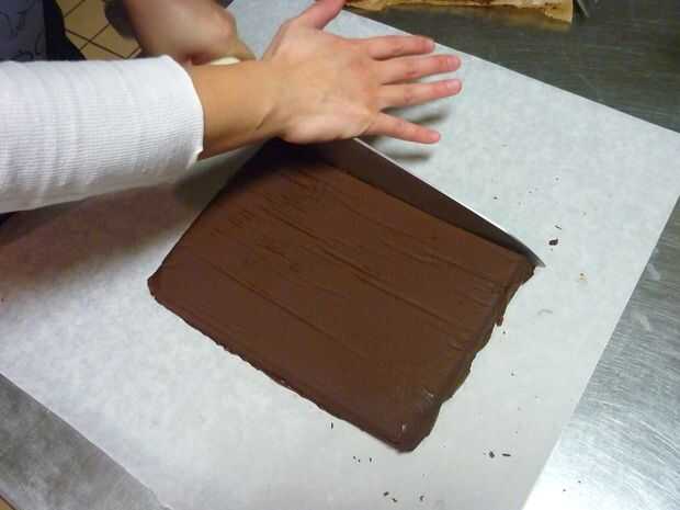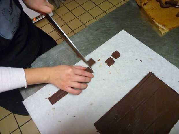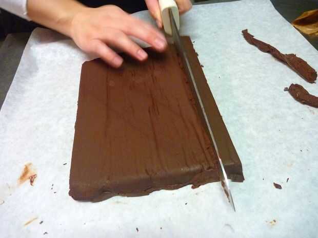 Retire el envoltorio plástico y colóquelo boca abajo sobre una corte del tablero cara abajo. Corte el ganache en cuadros de 1 pulgada.