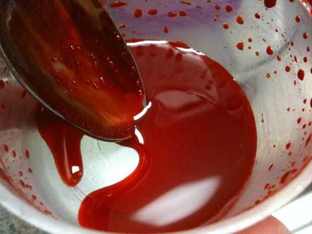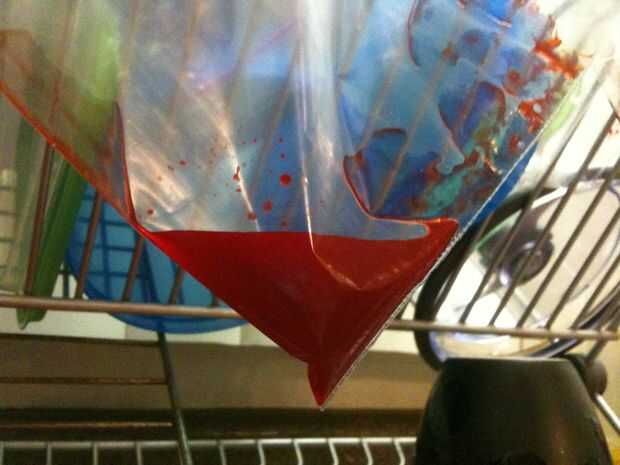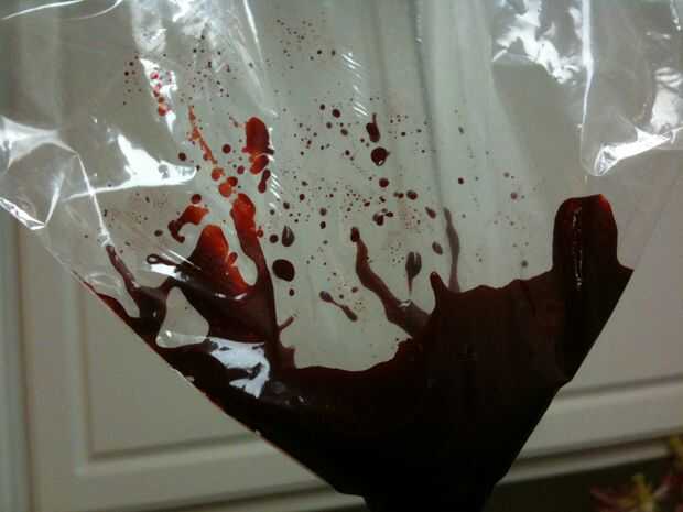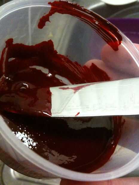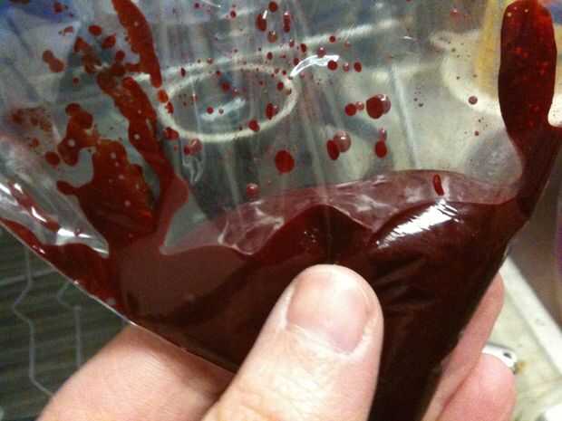 Después mezclé el brebaje sangriento, llevó lo con una cuchara en una bolsa de plástico para tuberías en el cerebro cuando el chocolate se derrita. El contenedor fue lleno de restos de sangre así que agregué algunos Vino Mirin o arroz y llevó a cabo la consistencia de la sangre drippy que quería rociar con. PERFECTO! Si desea, puede utilizar algunos otros alcohol. Usted no realmente ser probarlo mucho, de todos modos. Es sólo para decorar. :) Entonces derramé mi sangre drippy en un ziploc para utilizarlo como el último paso. (Rociar ligeramente cada cerebro).