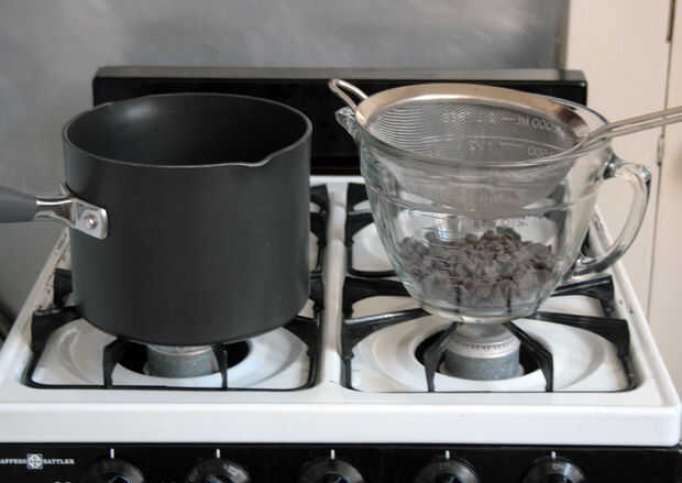 Una vez que has esperado los 15 minutos requeridos, Martha nos dice que llevar la mezcla a hervir, verter a través del tamiz sobre los pedazos de chocolate y revolver para derretir.