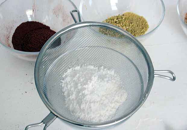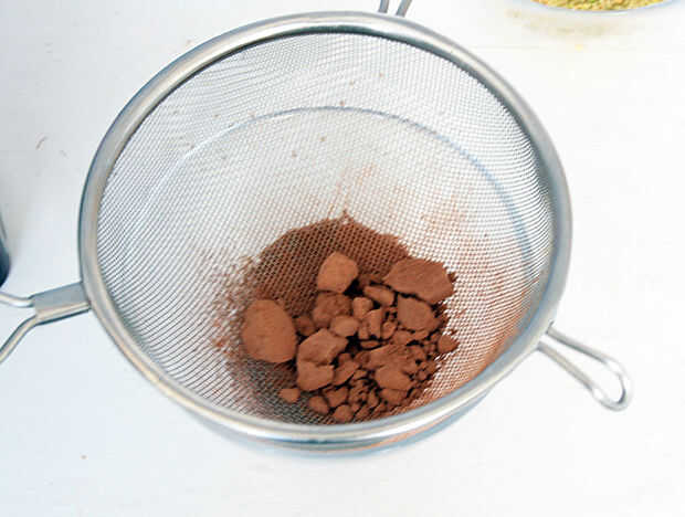 El cacao y el azúcar en polvo (Glas) deben tamizadas antes de utilizarlo para deshacerse de su inherente lumpiness.