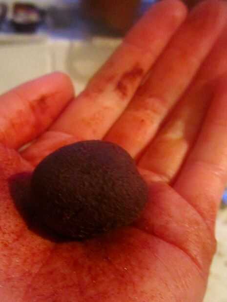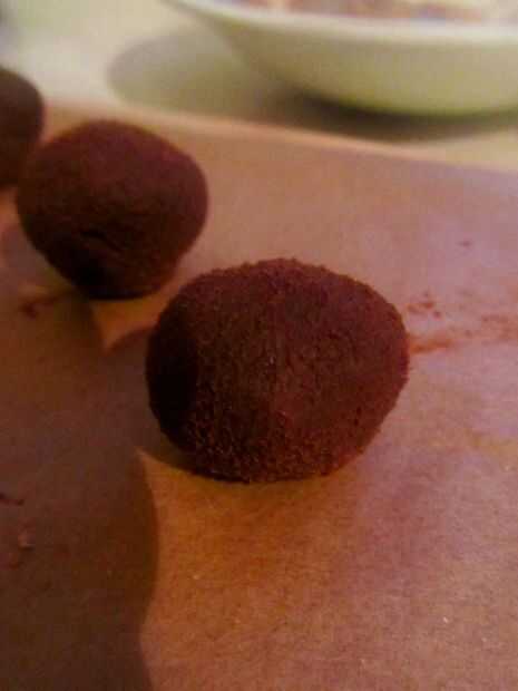 Cuando la mezcla esté firme, raspe a pequeñas cucharadas y rodar en bolas. Este es un trabajo pegajoso, aunque el desastre puede ser puesto apagado un poco si se separan un poco de aceite en las manos primero.
