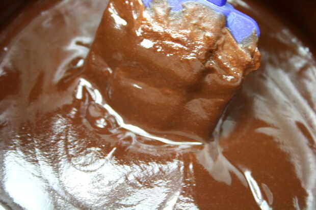 Revuelva con una espátula cada 5-10 minutos hasta que el chocolate es derretido y suave. Asegúrate de raspar los lados y las esquinas bien. Nota: Me tomó aproximadamente 6 revuelve hasta que el chocolate estaba derretido y ribbony. Nota: Si alguna vez no has derretido chocolate antes, he añadido imágenes para mostrar la progresión del chocolate que derrite. Es un poco horrible durante la primera mitad, pero se fundirá todos - mantener la fe!
