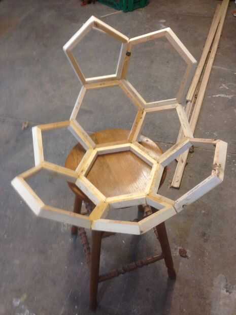 Un icosaedro truncado se compone de 20 hexágonos y 12 pentágonos. He utilizado 5" arrancaron largos trozos de pino de 3/4" x 3/4". Corte las puntas de los hexágonos en 30 grados y los pentágonos en 36 grados. La parte más difícil de todo el proyecto fue calcular el biselado de los bordes de las formas. Si se corta este derecho, que se unen perfectamente y terminan de forma uniforme. Mal y sus bordes no se alinean en todos. Pequeños errores son exagerados a medida que avanza el proyecto.