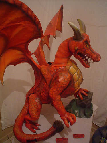 Hecho de fibra de vidrio. Tiene movimiento en su boca y humo por la nariz.