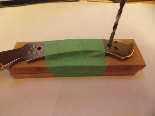Utilizando el taladro y el 1/8" taladro perforar a través de las escalas de sus remaches. Tome una segundo 1/8" bit pop en el primer agujero perforado para ayudar a sostener el cuchillo en su lugar mientras usted taladre el segundo agujero.