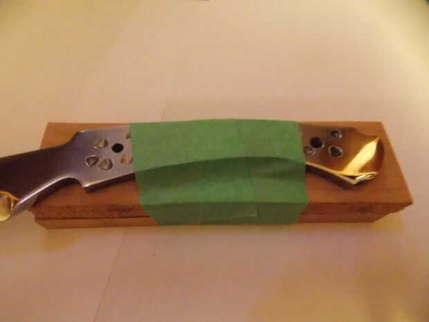 Necesita dos piezas idénticas para cada escala de mango y tiene la formación de los agujeros de remache con dos remaches (use varilla de soldadura, corte a la longitud y luego acanalado). Utilicé un viejo truco de carpinteros, utilizando cinta adhesiva de dos y cinta las dos escalas juntos antes de comenzar. Cinta adhesiva cinta de tang a la madera abajo (le da la tercera mano) asegurando los agujeros para sus pines están expuestos.